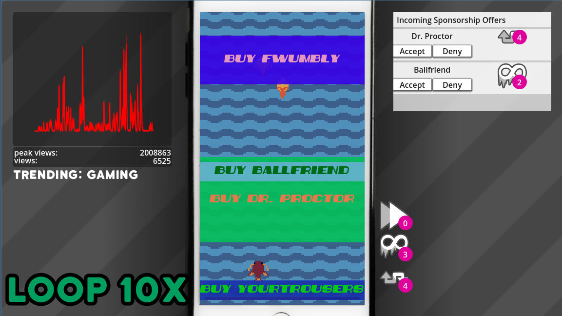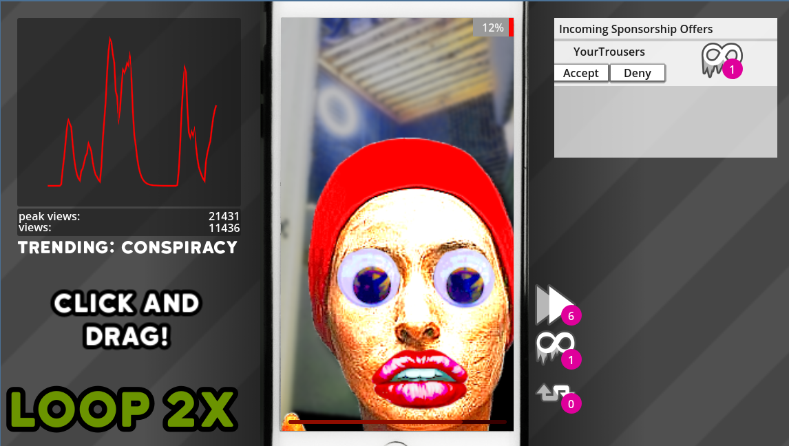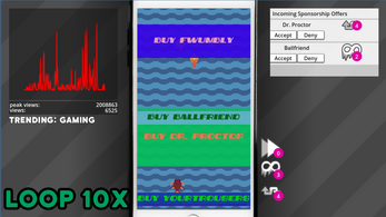 Make looping short-form vertical aspect ratio video content as quickly as possible through a slew of minigames, trying to end exactly how you started for that perfect loop. When you run out of time... Try again. There's always room on the Views leaderboard for someone like you.