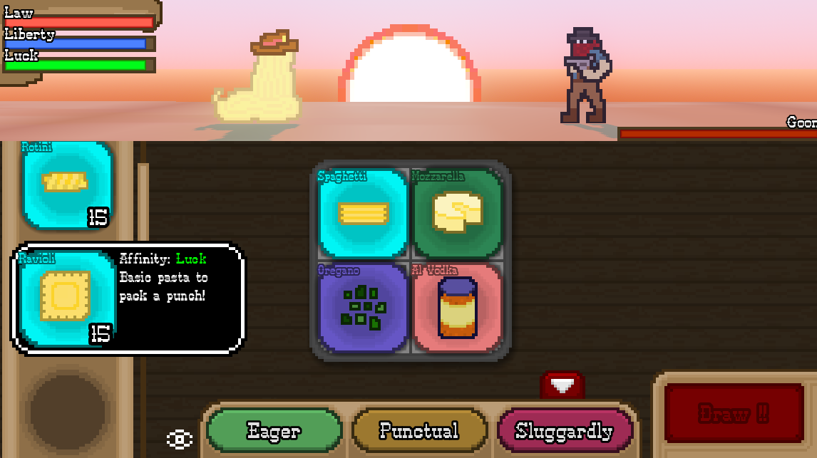 Big Joe's boys are running wild in the west, and only a pile of spaghetti, possessed by the hat of a dead lawman can stop them. Dish out justice by combining pasta ingredients to create over 1800 unique recipes to fight back against Big Joe's gun-toting goons. Only the best recipes will bring justice to the west before your foes bring you to starchy oblivion.